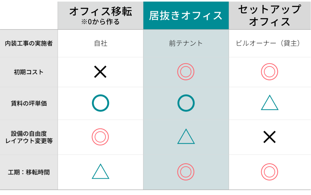 特に居抜きオフィスの唯一のメリット・優位性は内装付オフィス・家具等がついているにもかかわらず、賃料が上乗せされない(相場)通りの物が多いため、セットアップオフィスのような内装がほしいけど、固定費を下げたいという両方のコスト面を重視するのであれば、居抜きオフィス一択になるでしょう。