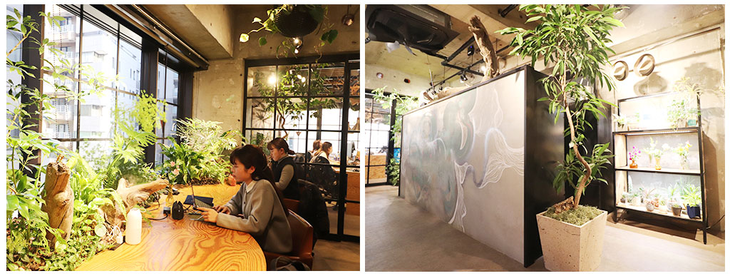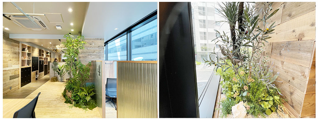 左写真:リニューアルされたばかりのすべてフェイクグリーンで飾られたオフィス空間