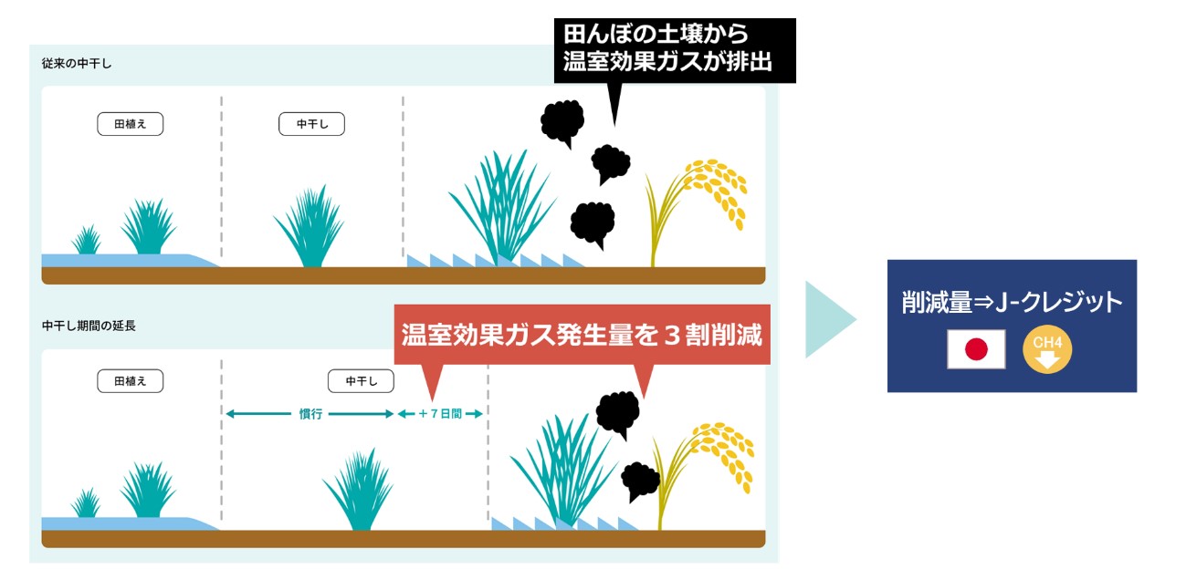 稲作には、稲の生育中に数日間、水田から水を抜いて土壌を乾かす“中干し”という作業があるんですが、『中干し期間延長』とはその期間をさらに7日延長して中干しすることで、土壌に酸素が供給されてメタン発生を3割程度抑えることができるというものです。