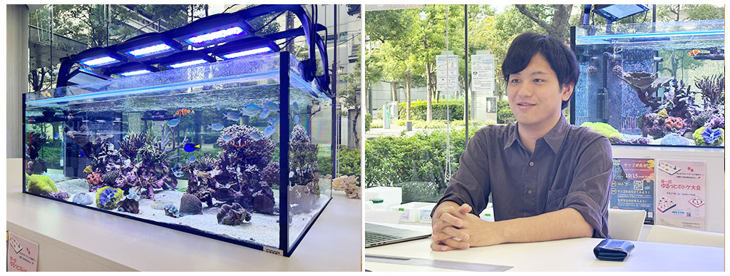 技術と知識で水槽の中に自然環境を再現する「環境移送技術®」。インタビューでお邪魔した文京区オフィス内の「イノカラボ」にも、サンゴ礁やマングローブ、サメなどが生息するたくさんの海が再現されており、地球環境研究の最前線にいるのだなと背筋が伸びるような思いを抱きました。
