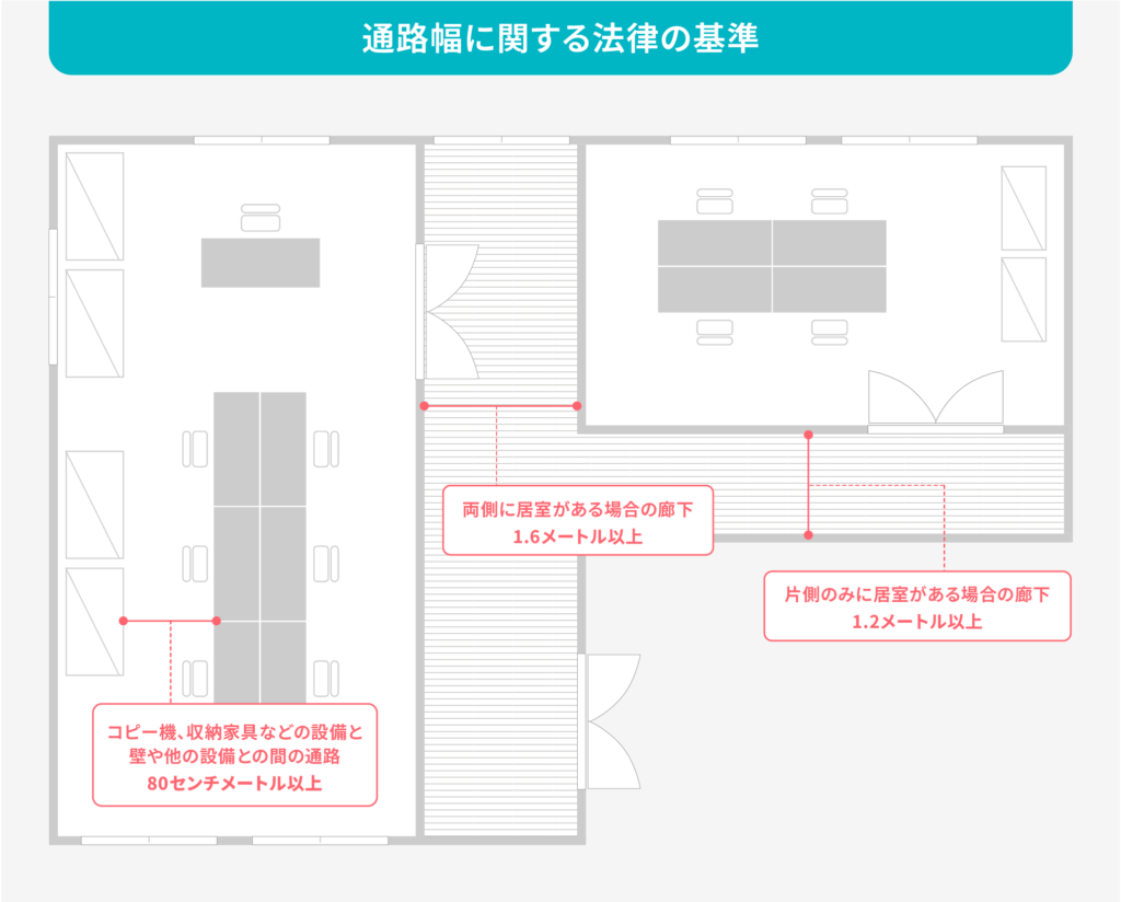 労働安全衛生法に基づく「事務所衛生基準規則」では、オフィス内の通路について、緊急時に従業員が安全に避難できるよう、その幅を規定しています。