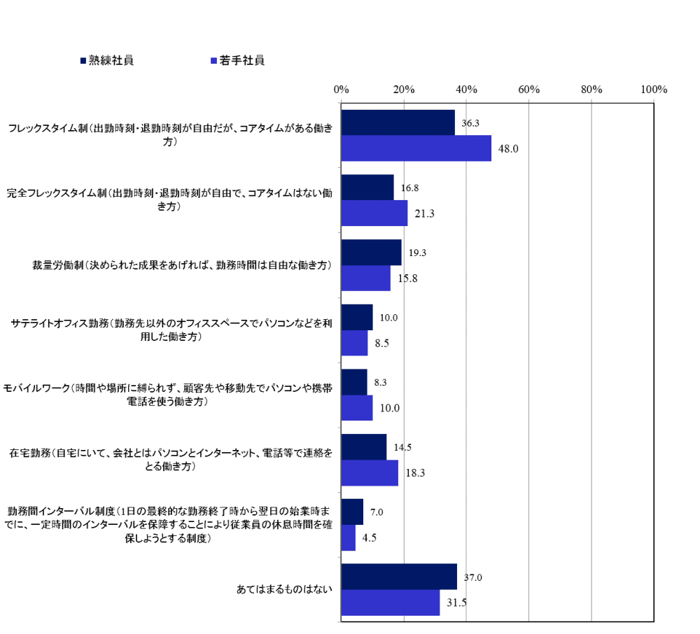 A2.熟練社員、若手社員ともに希望する働き方1位はコアタイムのある「フレックスタイム制」、2位は、熟練社員は「裁量労働制」、若手社員は「完全フレックスタイム制」という結果になりました。